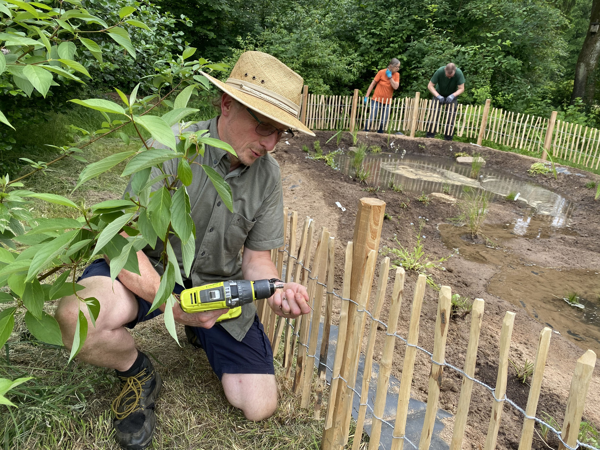 Mit der Fertigung des Feuchtbiotopes geht ein langer Wunsch in Erfüllung. Als Tränke für u.a. Vögel, Schmetterlinge oder Wildbienen ist es ein wichtiges Biotop. Schon jetzt ist zu sehen,